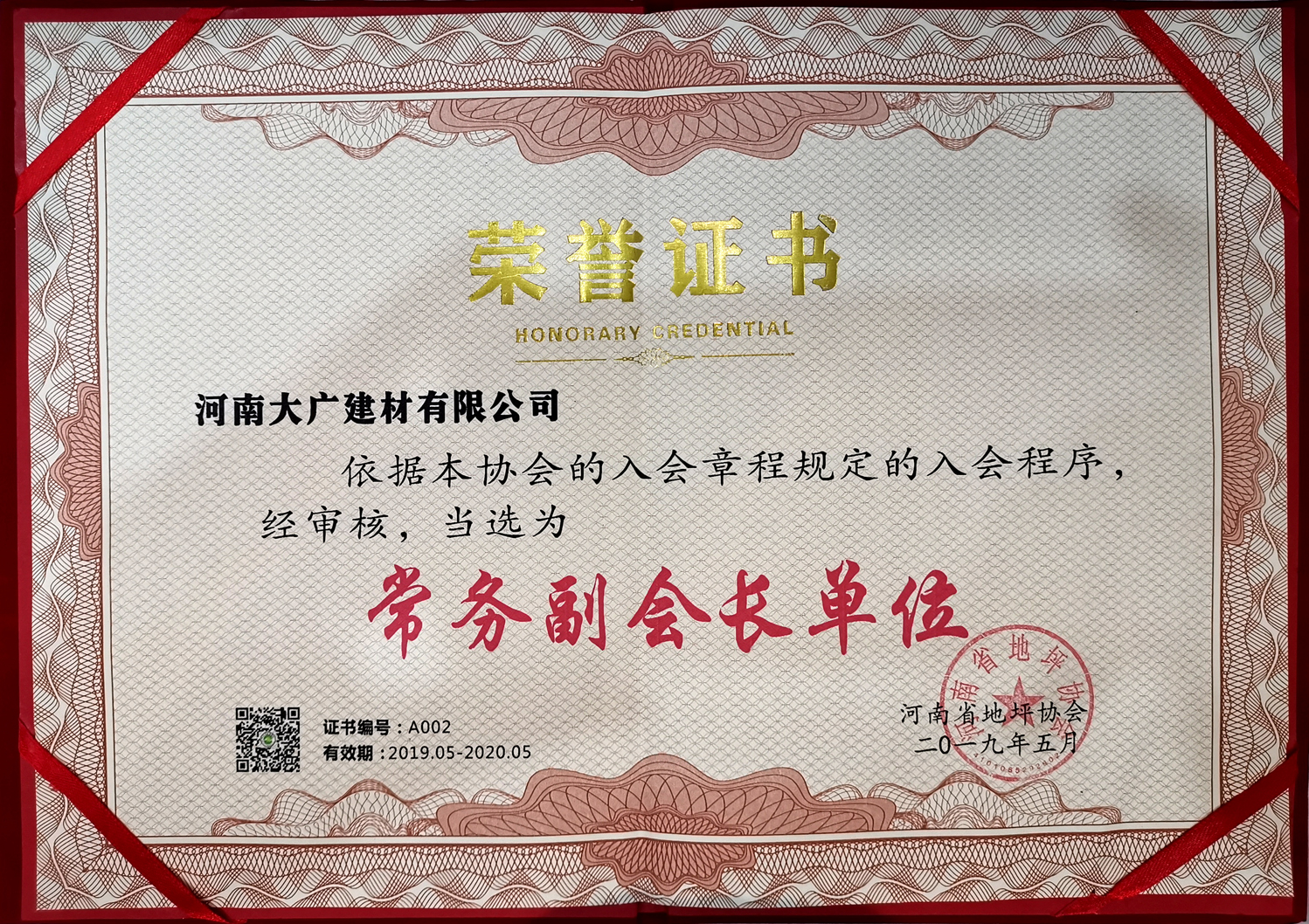 2019年度 常務(wù)副會長單位 證書